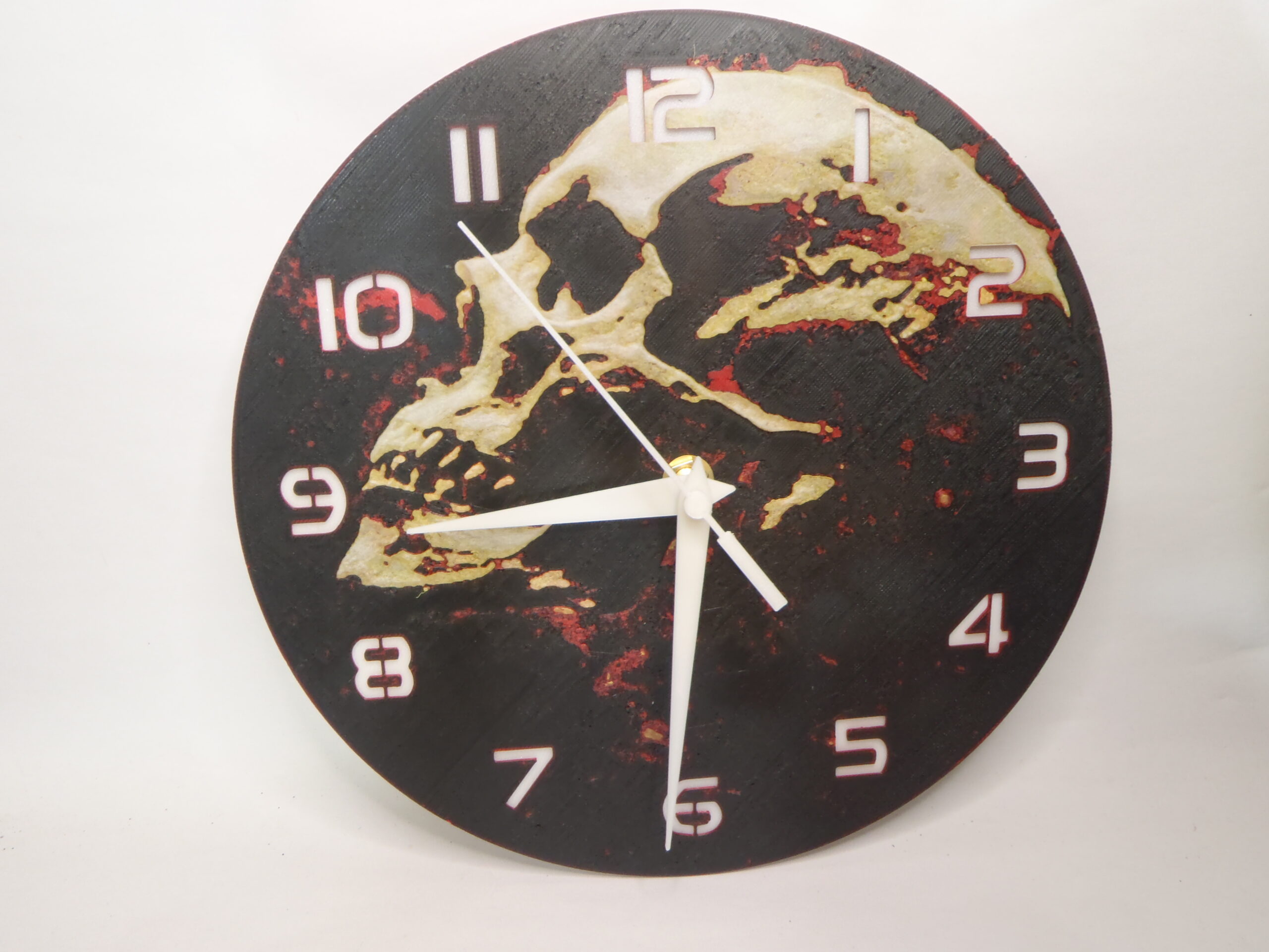 Horloge Crâne peut être fixée sur un mur ou posée sur un socle ( en option ) couleur du socle conseillée pour ce modèle ” blanc  ” , imprimée en PLA .