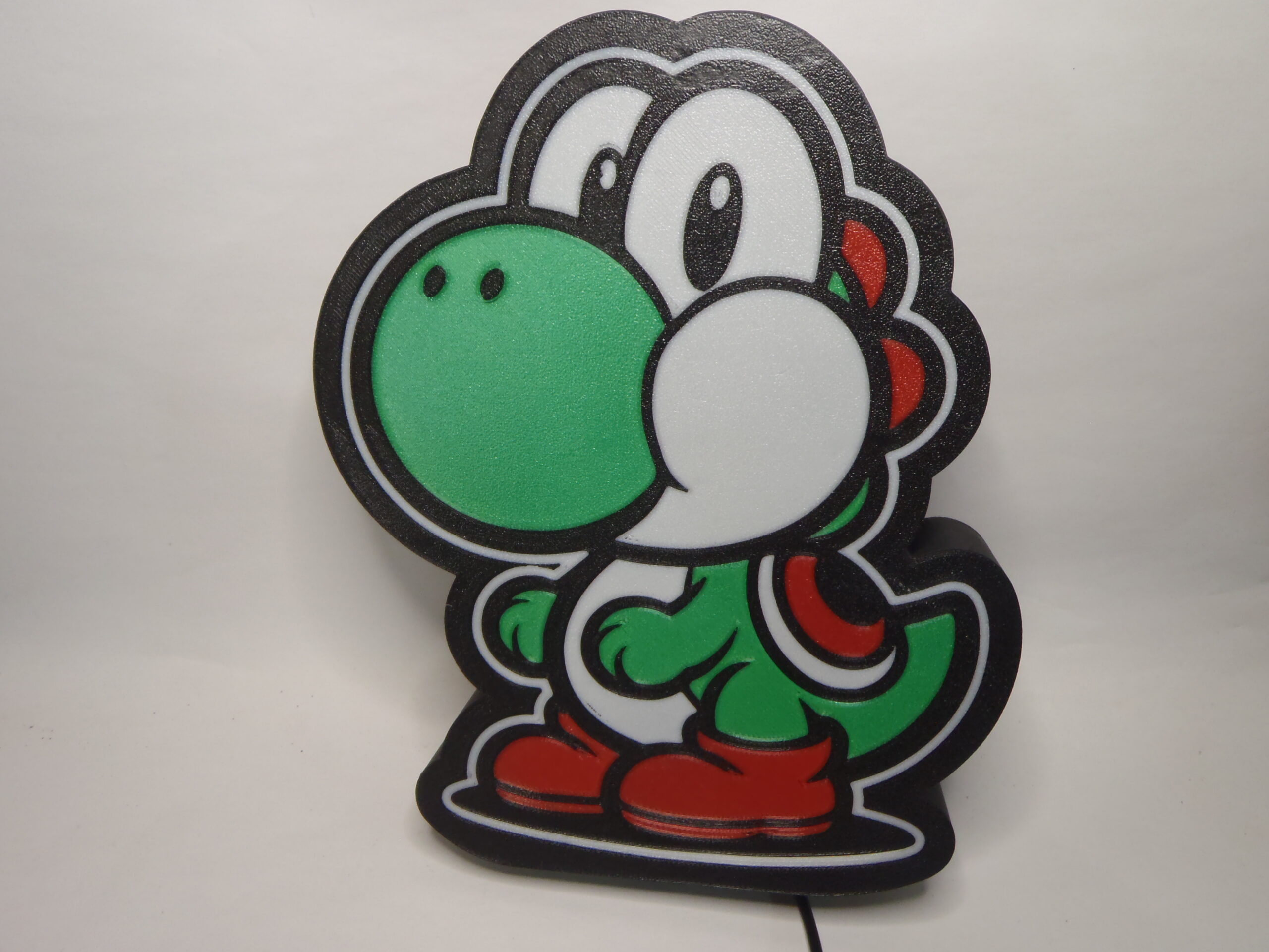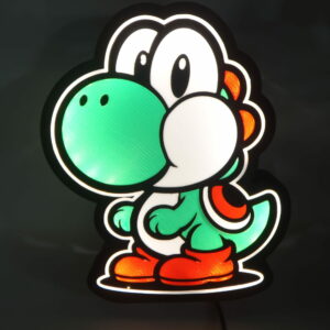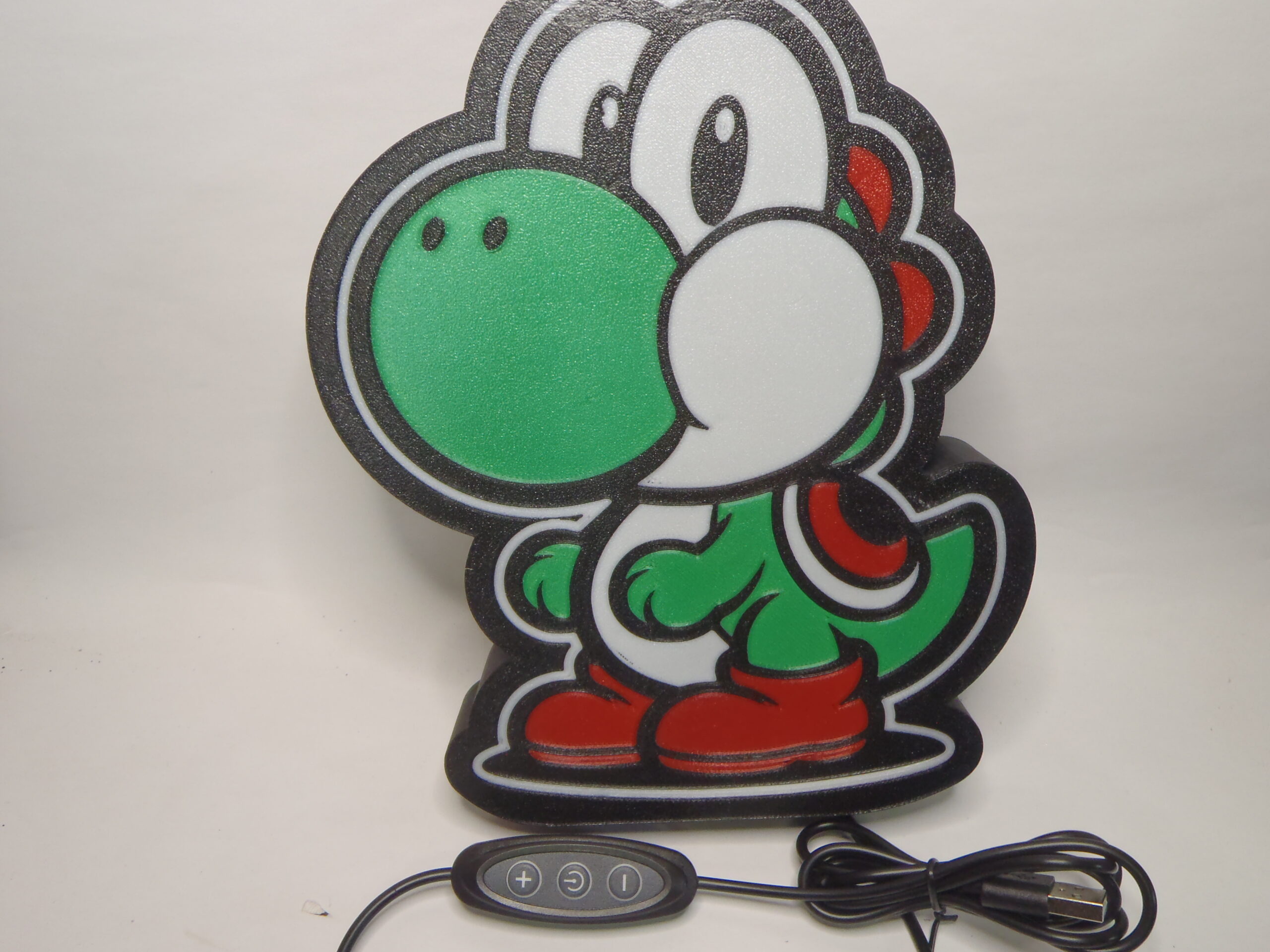 Lampe Yoshi alimentée par un cordon usb d’une longueur de 1.40 m avec un boîtier interrupteur et variateur d’intensités ( chargeur en option ) , imprimée en PLA .